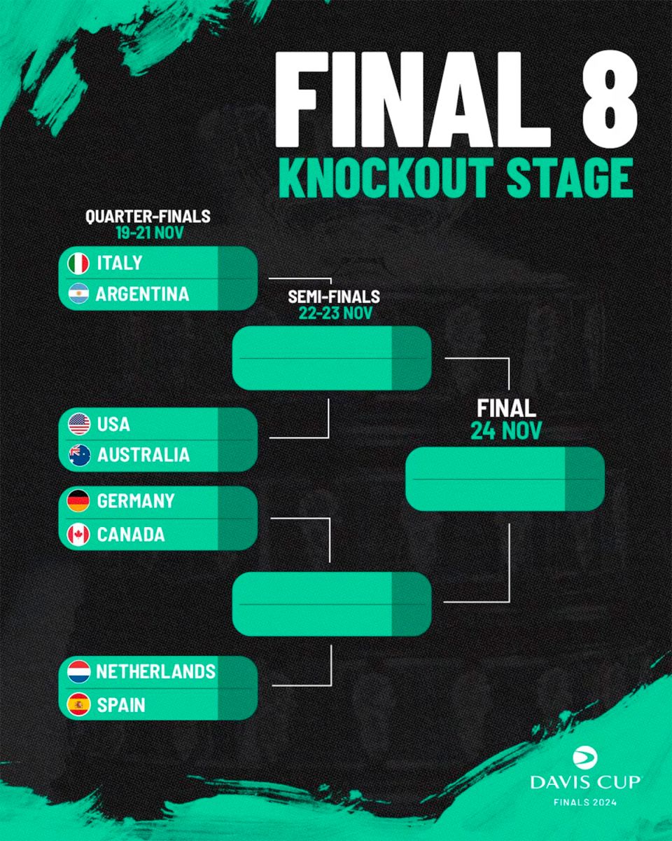 Además del choque entre Italia y Argentina, la fase de cuartos de final de la Copa Davis contará con otros enfrentamientos de alto nivel. España, el país anfitrión, se enfrentará a Países Bajos, mientras que Estados Unidos se medirá ante Australia. Por otro lado, Canadá, campeón en 2022, jugará contra Alemania.