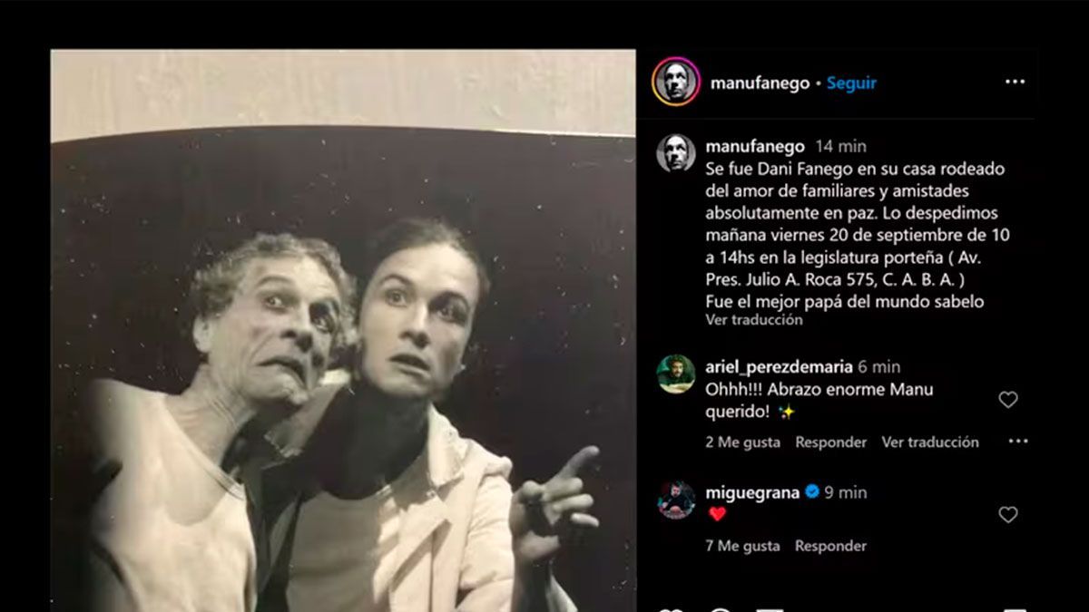 Minutos después, el propio Manu publicó un sentido posteo en su cuenta de Instagram junto con una foto en compañía de su padre, durante una actuación en conjunto en la obra El vuelo del Cóndor en el marco del histórico ciclo Teatro por la Identidad. “Se fue Dani Fanego en su casa rodeado del amor de familiares y amistades absolutamente en paz”, expresó. Asimismo, dio detalles de lo que será el funeral del reconocido actor: “Lo despedimos mañana viernes 20 de septiembre de 10 a 14 horas en la Legislatura Porteña (Av. Pres. Julio A. Roca 575, Ciudad Autónoma de Buenos Aires)”.