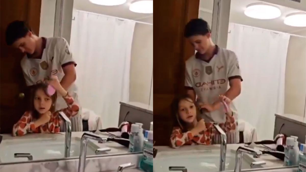 Se los pudo ver a los dos hermanos en el antebaño de la casa del actor, frente al espejo, mientras el adolescente le cepilla el cabello a su hermanita y le pasa el secador.