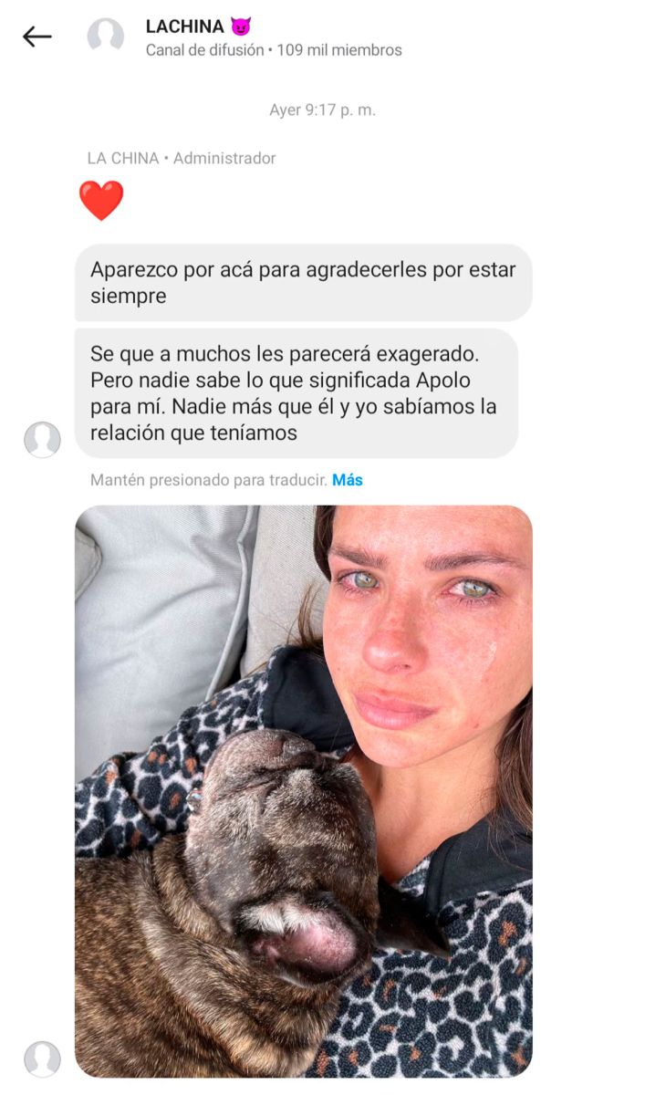En la postal que compartió se la puede ver a la China abrazada al perrito con el que compartió más de diez años de su vida. En la cara de la actriz se notaba su profundo dolor y angustia por tener que despedir a su fiel compañero.