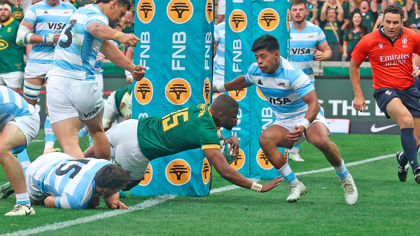 PUNTOS EN EL PRIMER TIEMPO: 7’ Try de Aphelele Fassi convertido por Jaden Hendrikse (SA), 14’ Try de Pieter-Steph du Toit convertido por Jaden Hendrikse (SA), 19’ Try de Tomás Albornoz convertido por él mismo (LP), 21’ Penal de Jaden Hendrikse (SA), 32’ Try de Aphelele Fassi (SA), 38’ Try de Cheslin Kolbe (SA).