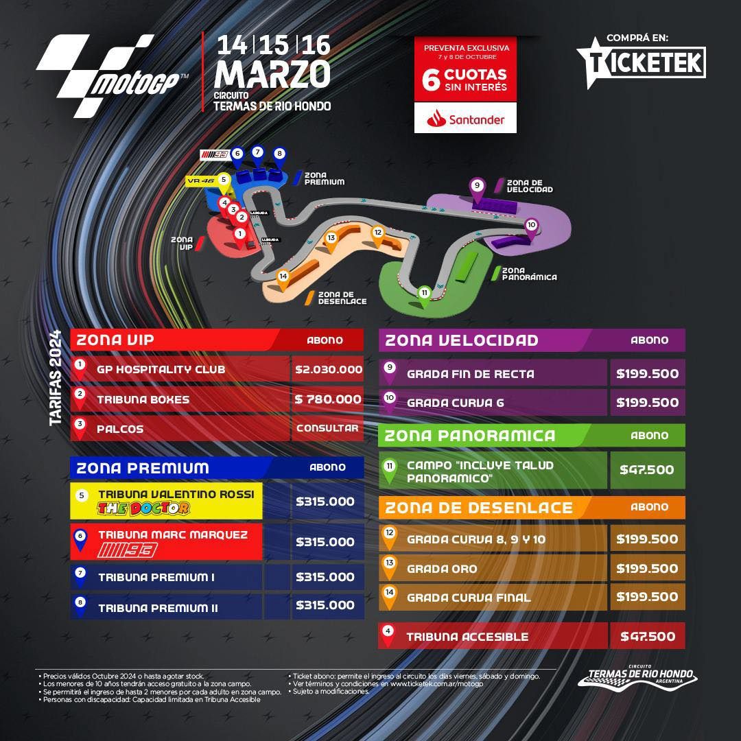 Los fanáticos del motociclismo podrán asegurar su lugar en la segunda fecha del campeonato mundial con una preventa exclusiva el 7 y 8 de octubre a través de Ticketek Argentina, mientras que la venta general comenzará el 9 de octubre.