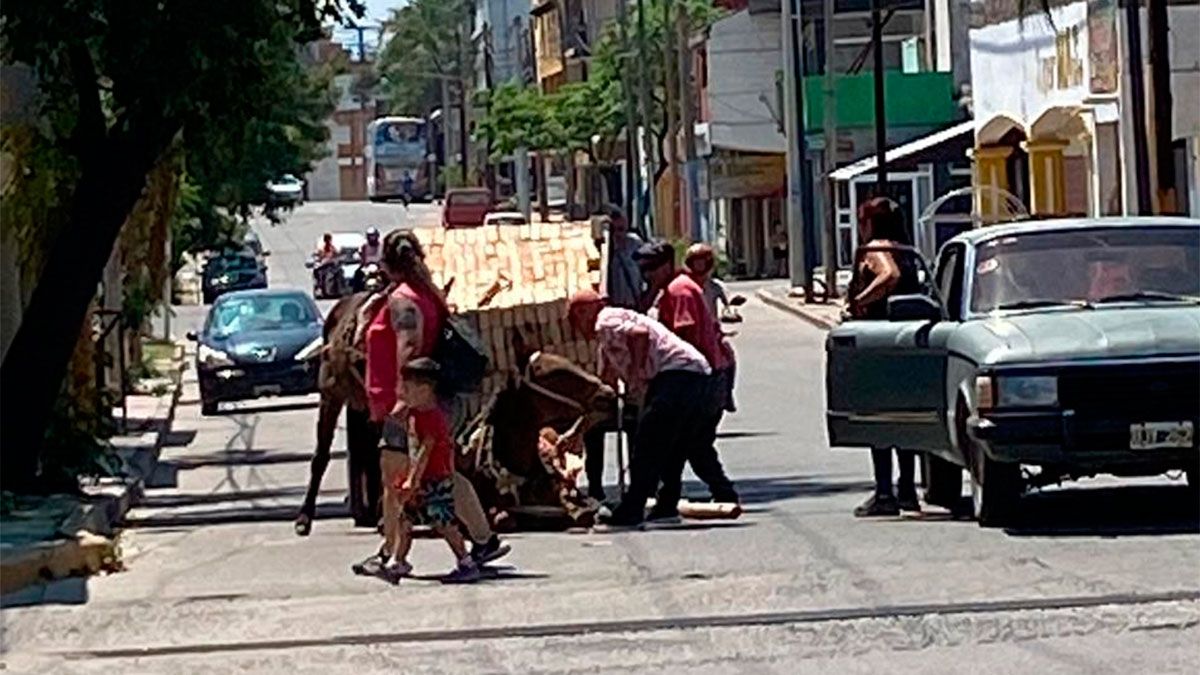 Dos caballos tiraban un carro cargado con ladrillos. A metros de llegar a ruta 9 uno de los equinos cayó al suelo ya sin fuerzas debido a la pesada carga.