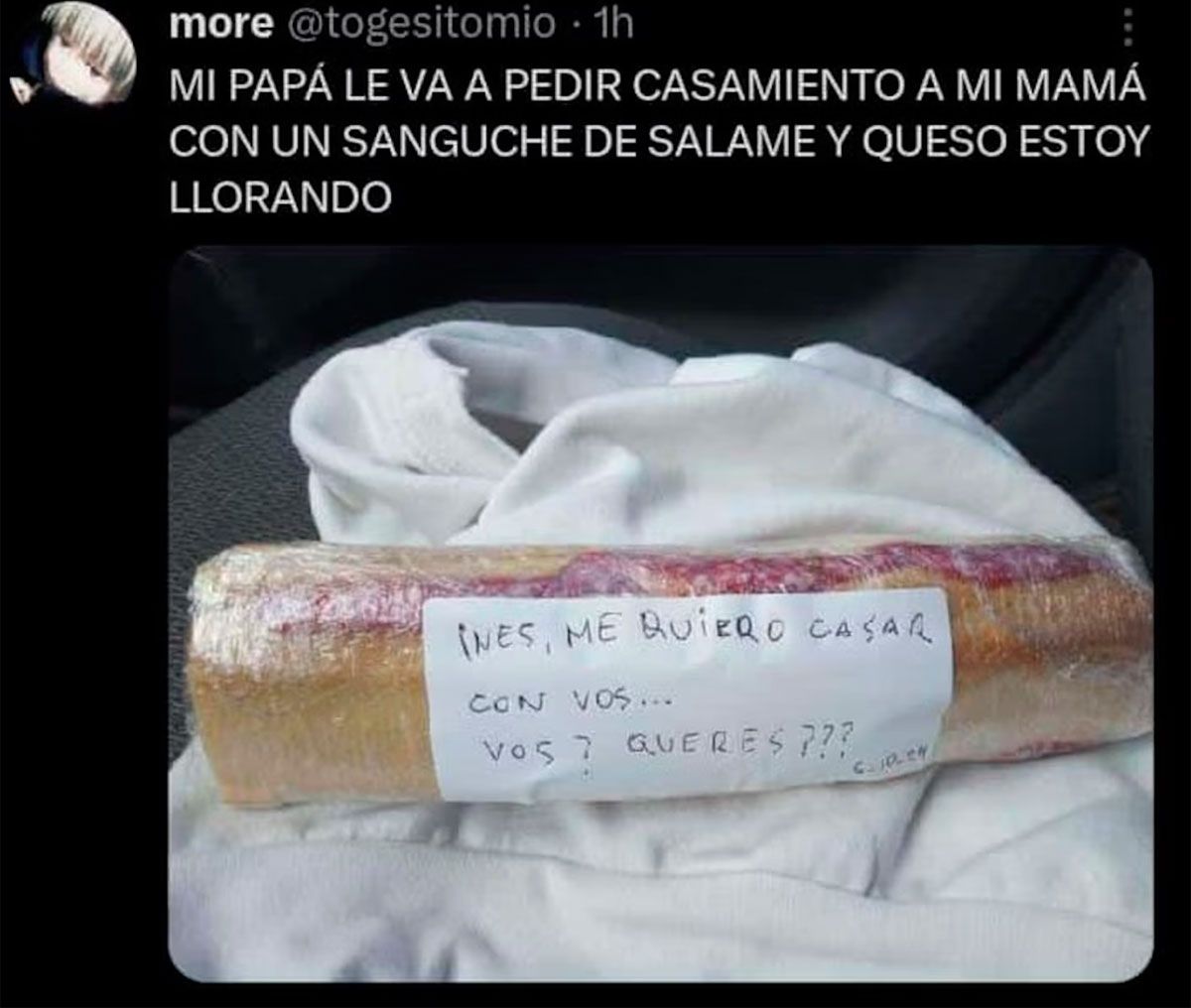 La publicación no tardó en viralizarse por la sencilla pero ingeniosa propuesta. “Mi papá le va a pedir casamiento a mi mamá con un sánguche de salame y queso. Estoy llorando”, escribió la joven junto a la imagen del peculiar sándwich.