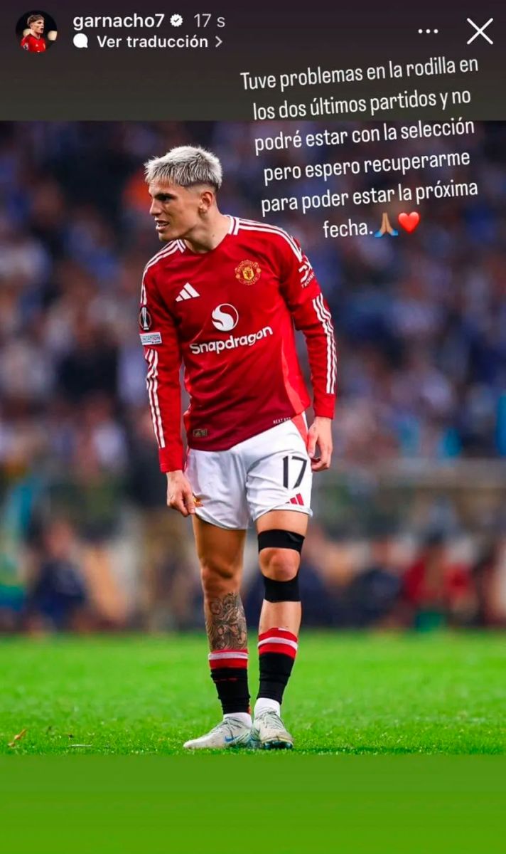 Garnacho, quien se había integrado exitosamente al equipo de Lionel Scaloni, ya había sumado minutos en la reciente victoria ante Chile y se perfilaba como una opción importante en el ataque. Sin embargo, tras sufrir molestias en sus últimos partidos en Inglaterra, el cuerpo técnico de la Albiceleste decidió que lo mejor era liberarlo de la convocatoria. El atacante comunicó su situación a través de redes sociales y expresó: “Tuve problemas en la rodilla en los dos últimos partidos y no podré estar en la Selección, pero espero poder recuperarme para la próxima fecha”.