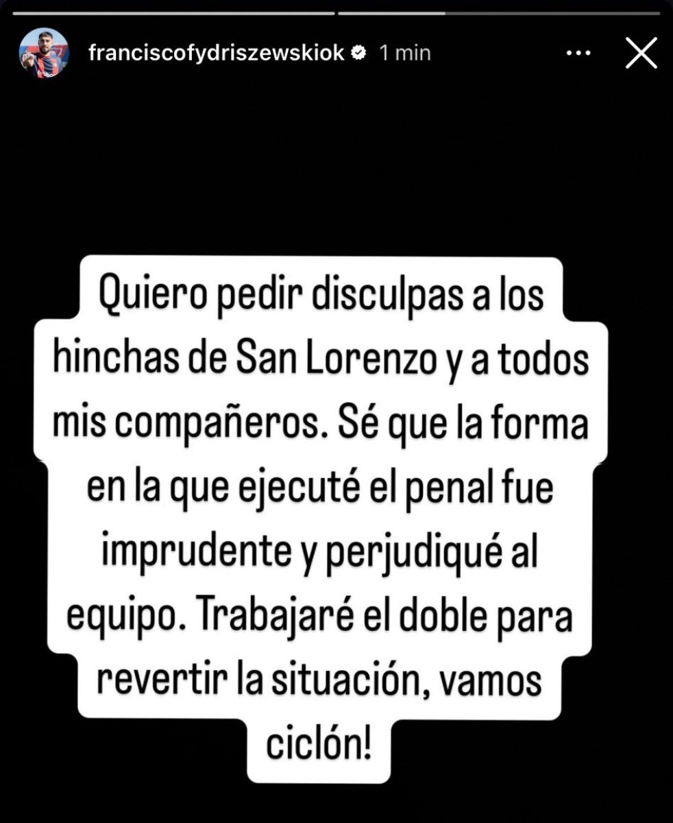 Consciente de la gravedad de su error, Fydriszewski se disculpó tanto en persona con sus compañeros como públicamente a través de sus redes sociales. “Quiero pedir disculpas a los hinchas de San Lorenzo y a todos mis compañeros. Sé que la forma en la que ejecuté el penal fue imprudente y perjudiqué al equipo”, manifestó, asumiendo la responsabilidad de su fallo.