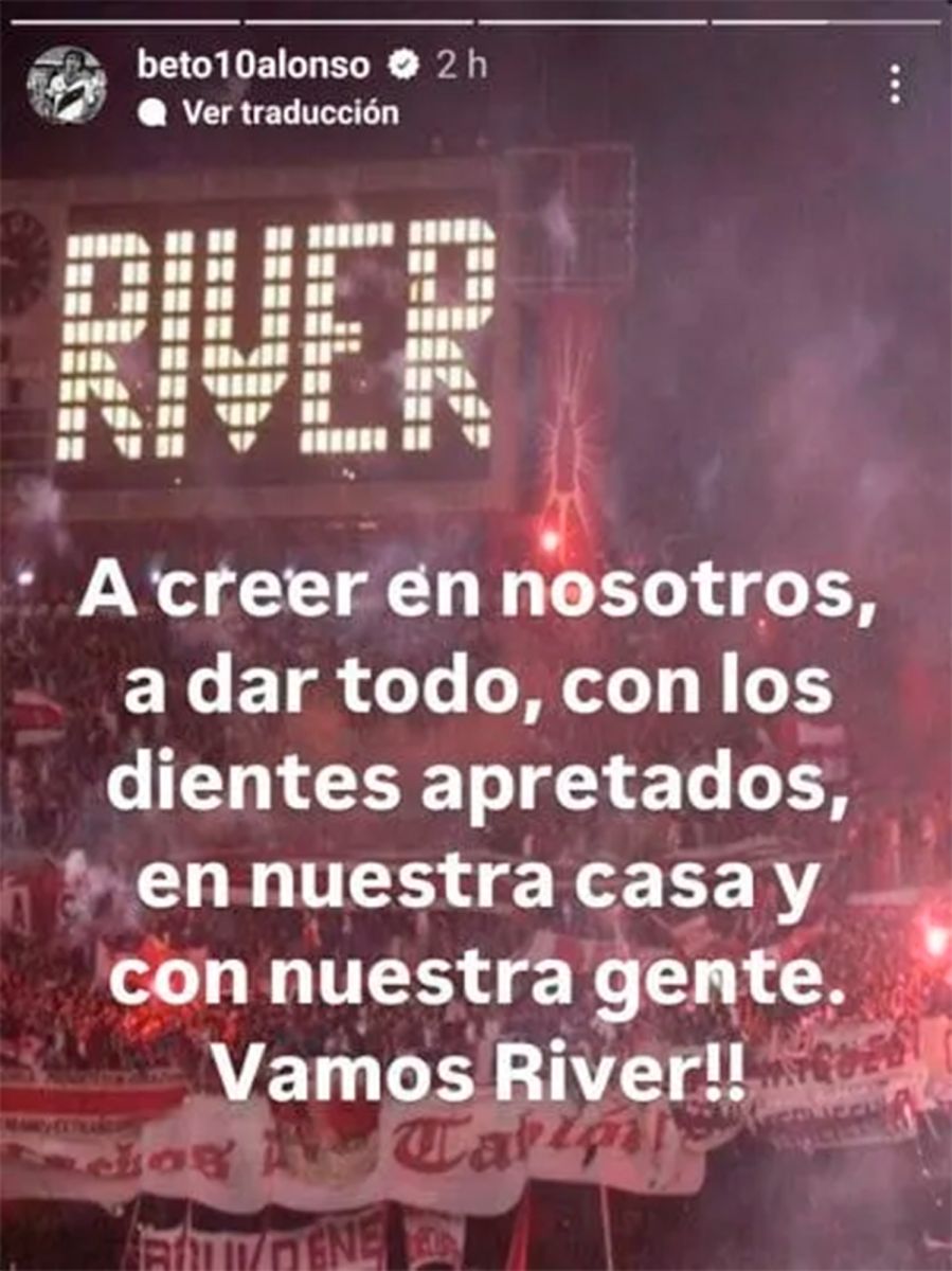 A su vez, el Beto, que sabe lo que significa ganar la Copa Libertadores con River, prefirió tocar la fibra íntima de los jugadores de cara a un apoteótico desafío. "A creer en nosotros, a dar todo, con los dientes apretados, en nuestra casa y con nuestra gente. Vamos River!!", sentenció el 10, secundado de una foto del estadio Monumental en los explosivos recibimientos de épocas noventosas.