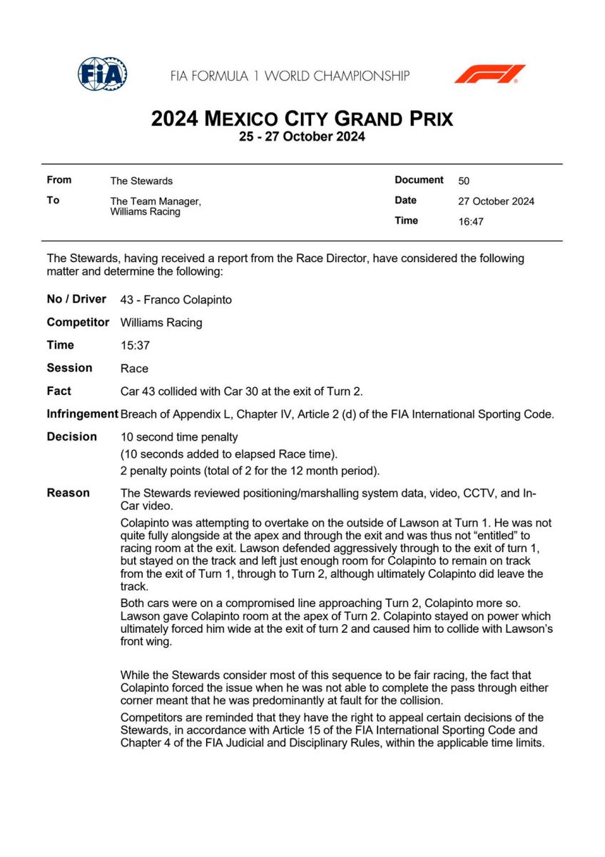 La maniobra se dio en la curva 1 del Autódromo Hermanos Rodríguez, donde Colapinto, con ayuda del DRS, se acercó rápidamente a Lawson (Racing Bulls) y lo superó al tomar la curva desde el exterior. Aunque logró mantener su puesto 12 tras el incidente, el contacto dejó a Lawson con daños en su alerón delantero, obligándolo a ingresar a boxes y terminar en el puesto 16. Los comisarios revisaron el incidente y sancionaron al argentino con 10 segundos de penalización y 2 puntos en su licencia, aunque afortunadamente para Colapinto, la sanción no modificó su posición final.