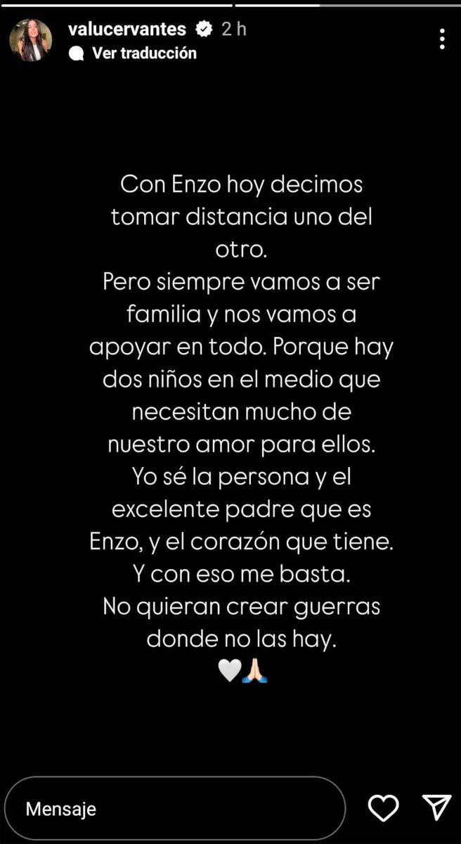 “Con Enzo hoy decidimos tomar distancia uno del otro, pero siempre vamos a ser familia y nos vamos a apoyar en todo porque hay dos niños en el medio que necesitan mucho de nuestro amor. Yo sé la persona y el excelente que es Enzo, y el corazón que tiene. Y con eso me basta. No quieran crear guerras donde no las hay”, escribió en Instagram.