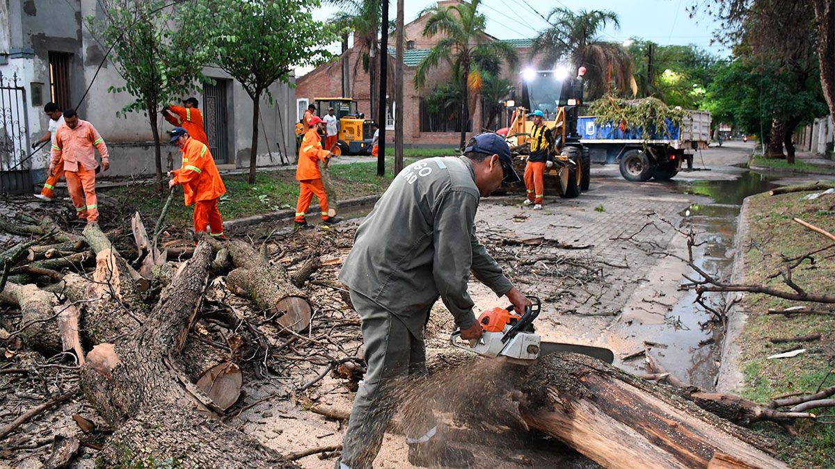 Defensa Civil, Arbolado Urbano, Servicios Urbanos, Electricidad y Parques y Paseos, a través de sus cuadrillas realizan las tareas y se mantienen en alerta ante la posible continuidad de las precipitaciones y vientos.