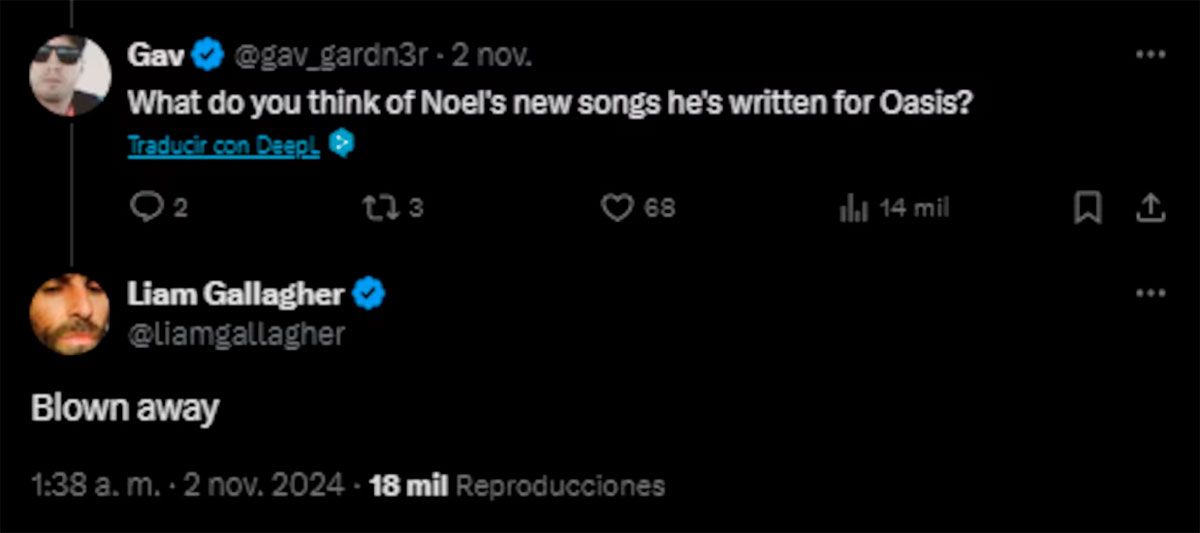 Un usuario de X llamado @gav_gardn3r, le preguntó a Liam qué pensaba de las canciones que Noel estaba escribiendo para el nuevo álbum, a lo que el menor de los Gallagher respondió: