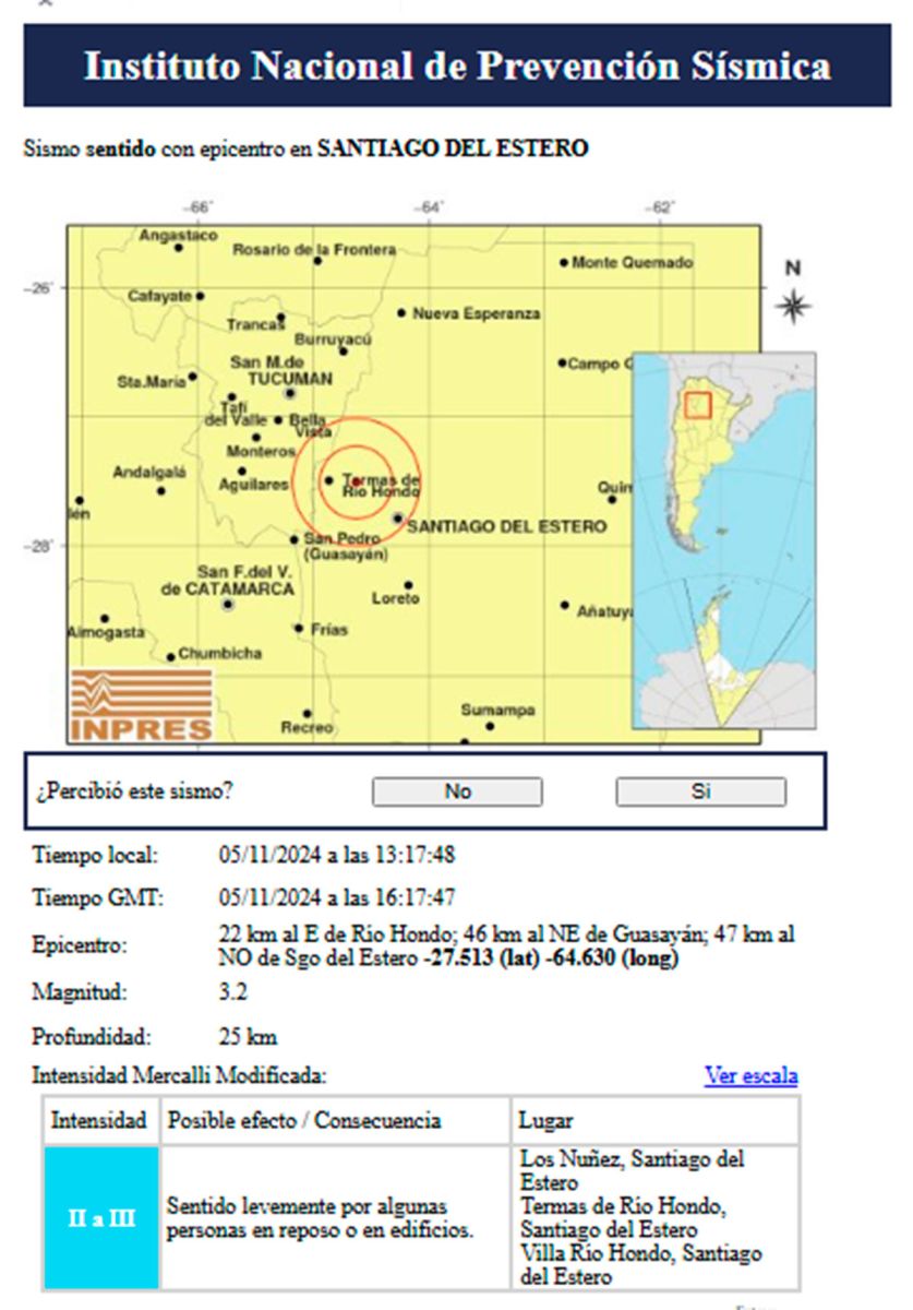 El movimiento telúrico ocurrió a las 13.17hs y tuvo epicentro a 22 km al este de Río Hondo; 46 km al noreste de Guasayán y 47 km al noroeste de Santiago del Estero.