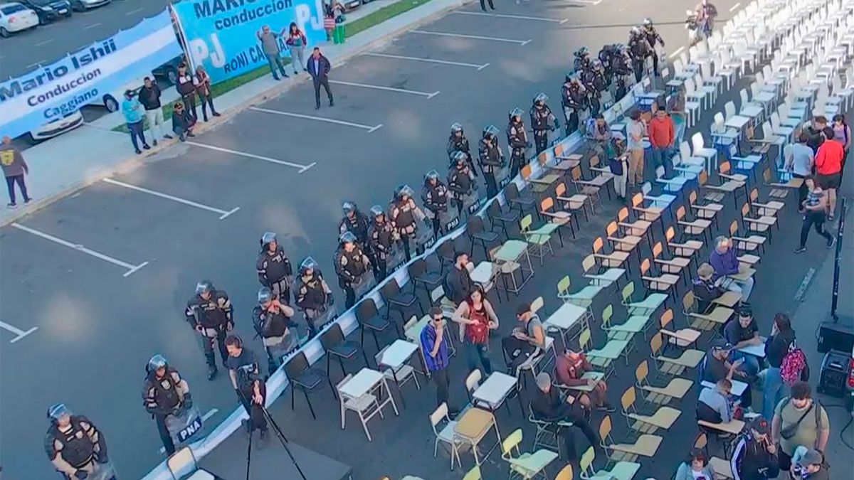 Sobre el acceso principal en la avenida Comodoro Py se instalaron hileras de sillas blancas a la espera del inicio de la clase abierta contra el "lawfare" anunciada por organizaciones que apoyan a la ex vicepresidenta y de la que participarán el ministro de Justicia bonaerense, Juan Martín Mena, y el dirigente social, Juan Grabois, entre otros.