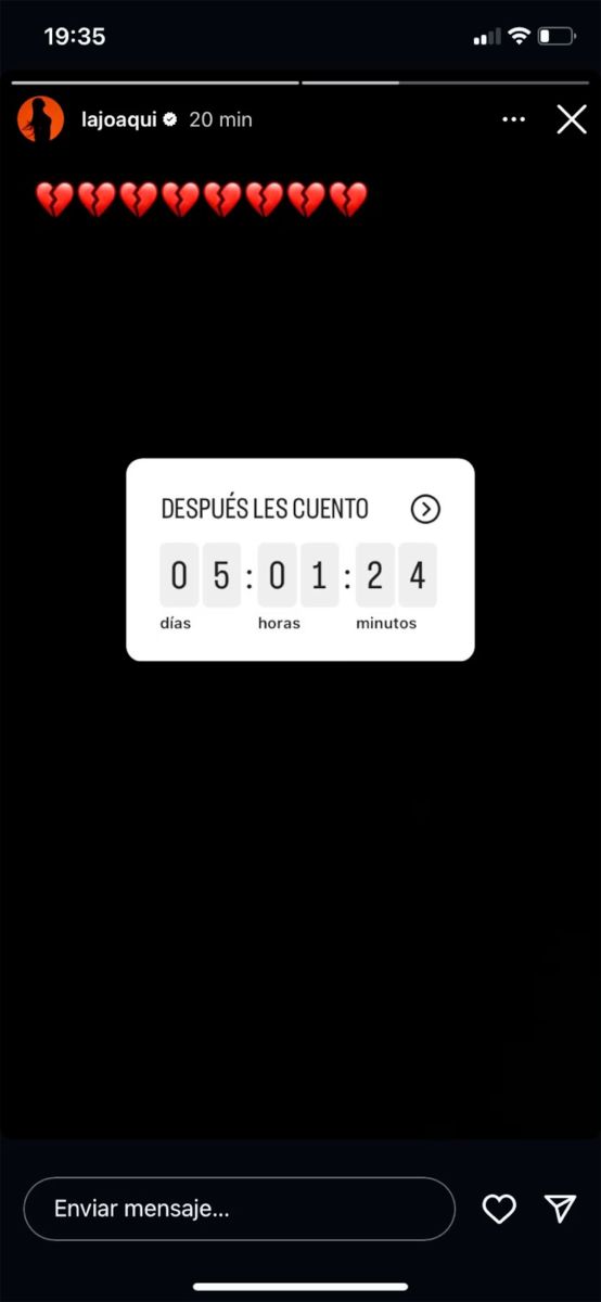 Mediante la herramienta de Instagram de Recordatorio, fijó una fecha para un anuncio que será en cinco días y escribió: “Después les cuento”, además de sumar emojis de corazones rotos, lo cual fue el indicio de una posible separación.