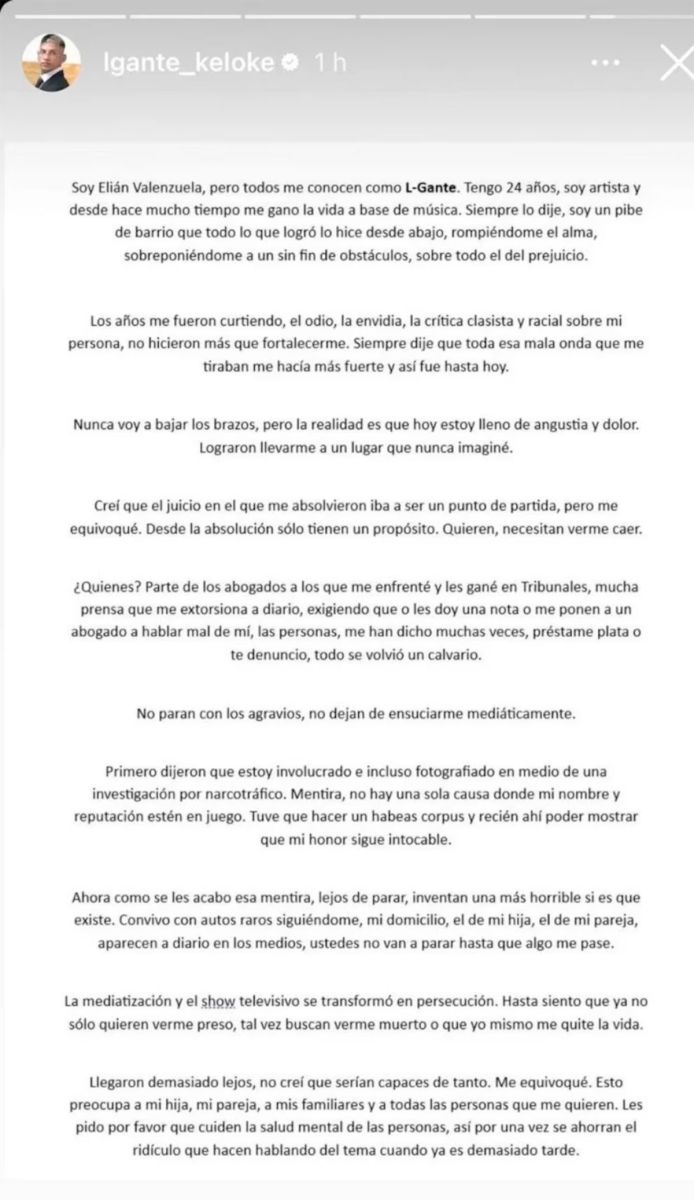 “Soy Elián Valenzuela, pero todos me conocen como L-Gante. Tengo 24 años, soy artista y desde hace mucho tiempo me gano la vida a base de música. Siempre lo dije, soy un pibe de barrio que todo lo que logró fue desde abajo, rompiéndose al alma, sobreponiéndose a un sin fin de obstáculos, sobre todo el del prejuicio”, dijo en un comunicado que compartió en Instagram.