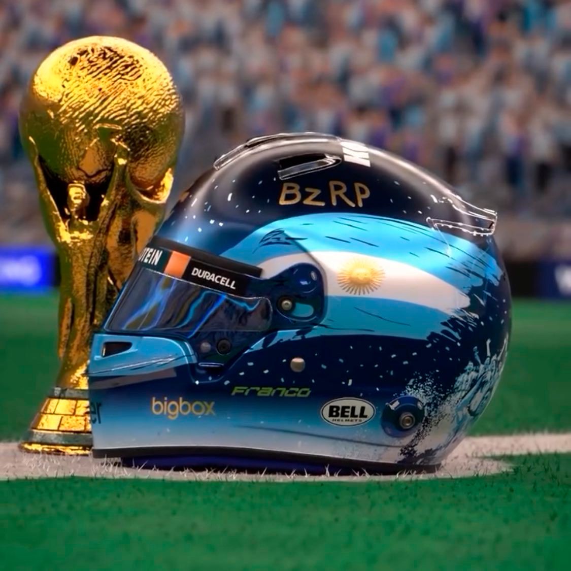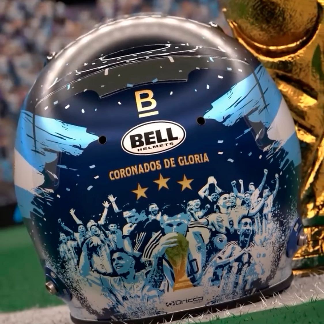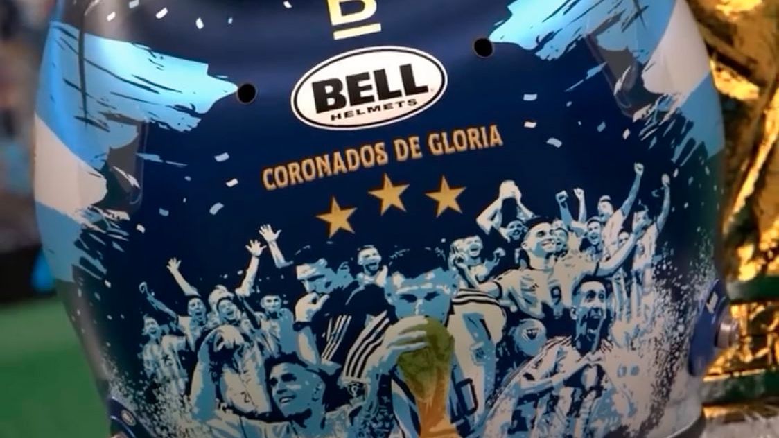 El casco, que Colapinto usará este fin de semana en el GP de Qatar en el Circuito Internacional de Lusail y en el cierre en Abu Dhabi, incluye los colores celeste y blanco, la imagen de la Copa del Mundo y las tres estrellas que representan los títulos logrados por la Albiceleste.