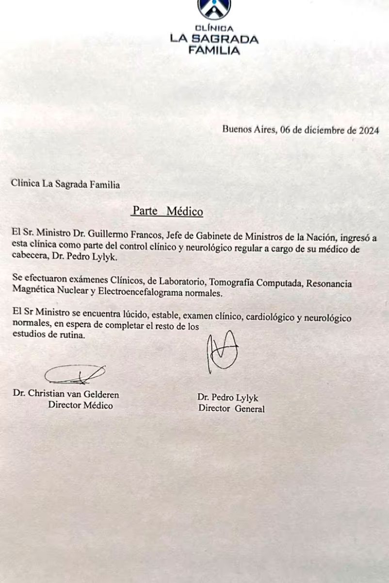 Pasado el mediodía, desde La Sagrada Familia emitieron el primer parte médico del jefe de Gabinete. “Ingresó a esta clínica como parte del control clínico y neurológico regular, a cargo de su médico de cabecera, Pedro Lylyk”, indicaron, a la vez que precisaron que a Francos le hicieron exámenes clínicos y de laboratorio, una tomografía computada, una resonancia magnética nuclear y un electroencefalograma.