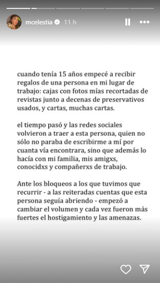 “El tiempo pasó y las redes sociales volvieron a traer a esta persona, quien no solo no paraba de escribirme a mí por cuanta vía encontrara, sino que además lo hacía con mi familia, mis amigxs, conocidxs y compañerxs de trabajo”, aseguró.