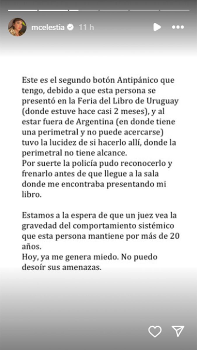 Entonces contó que este es el segundo botón antipánico que tiene y que se lo dieron por un reciente hecho. “Esta persona se presentó en la Feria del Libro de Uruguay (donde estuve hace casi 2 meses), y al estar fuera de la Argentina (en donde tiene una perimetral y no puede acercarse) tuvo la lucidez de sí hacerlo allí, donde la perimetral no tiene alcance”, relató. Y aclaró: “Por suerte la policía pudo reconocerlo y frenarlo antes de que llegue a la sala donde me encontraba presentando mi libro”.