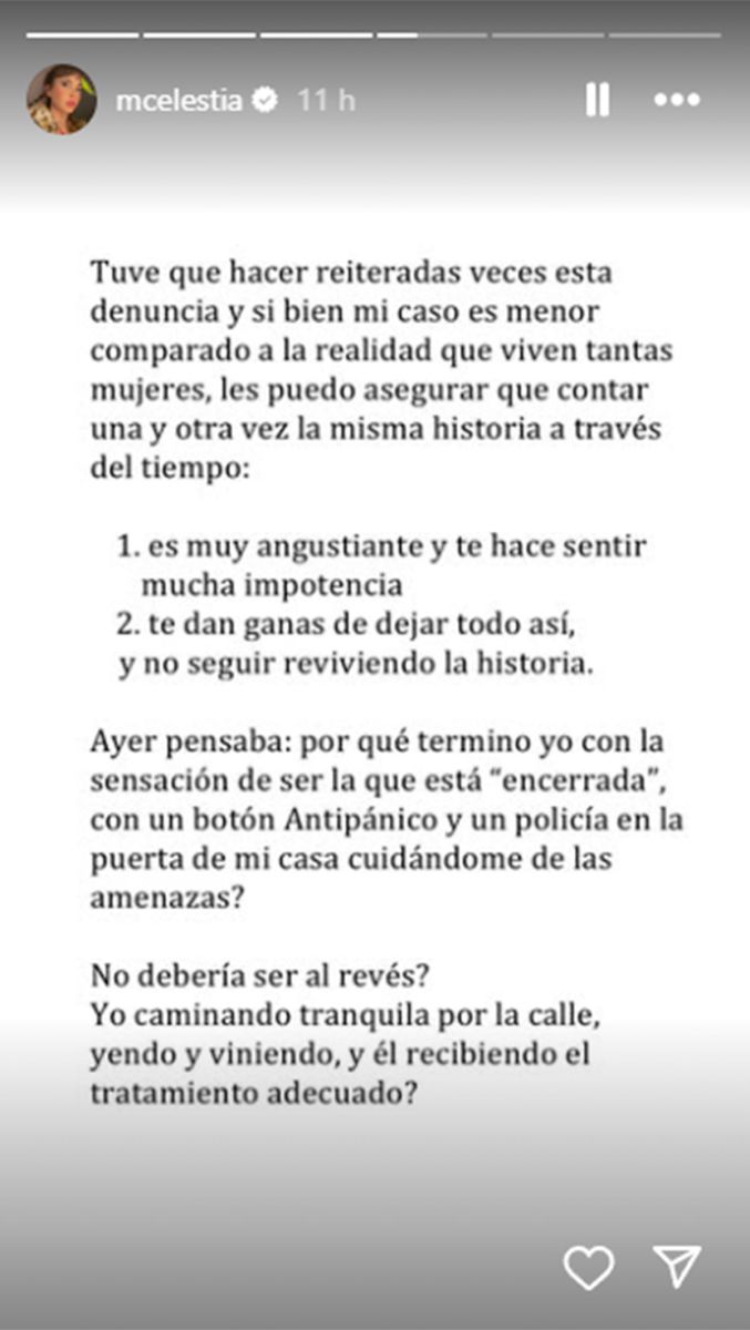 Celeste Cid contó que tuvo que hacer reiteradas veces esta denuncia. “Si bien mi caso es menor comparado a la realidad que viven tantas mujeres, les puedo asegurar que contar una y otra vez la misma historia a través del tiempo: es muy angustiante y te hace sentir mucha impotencia, y te dan ganas de dejar todo así, y no seguir reviviendo la historia”.