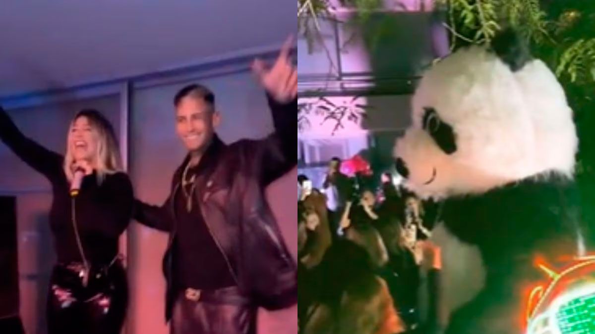 El ambiente estuvo decorado con globos rosas y negros, mucho brillo y disfraces que hicieron del lugar un escenario digno de revista. Uno de los elementos más llamativos fue un oso polar gigante que posó como parte del show visual, robándose el protagonismo en las fotos de los invitados.