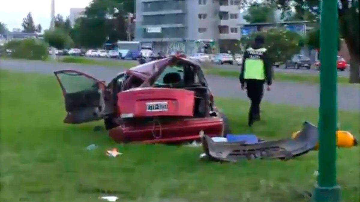 La fuerza del choque provocó el vuelco del Chevrolet Corsa, que terminó impactando contra un semáforo, dejándolo completamente destruido.