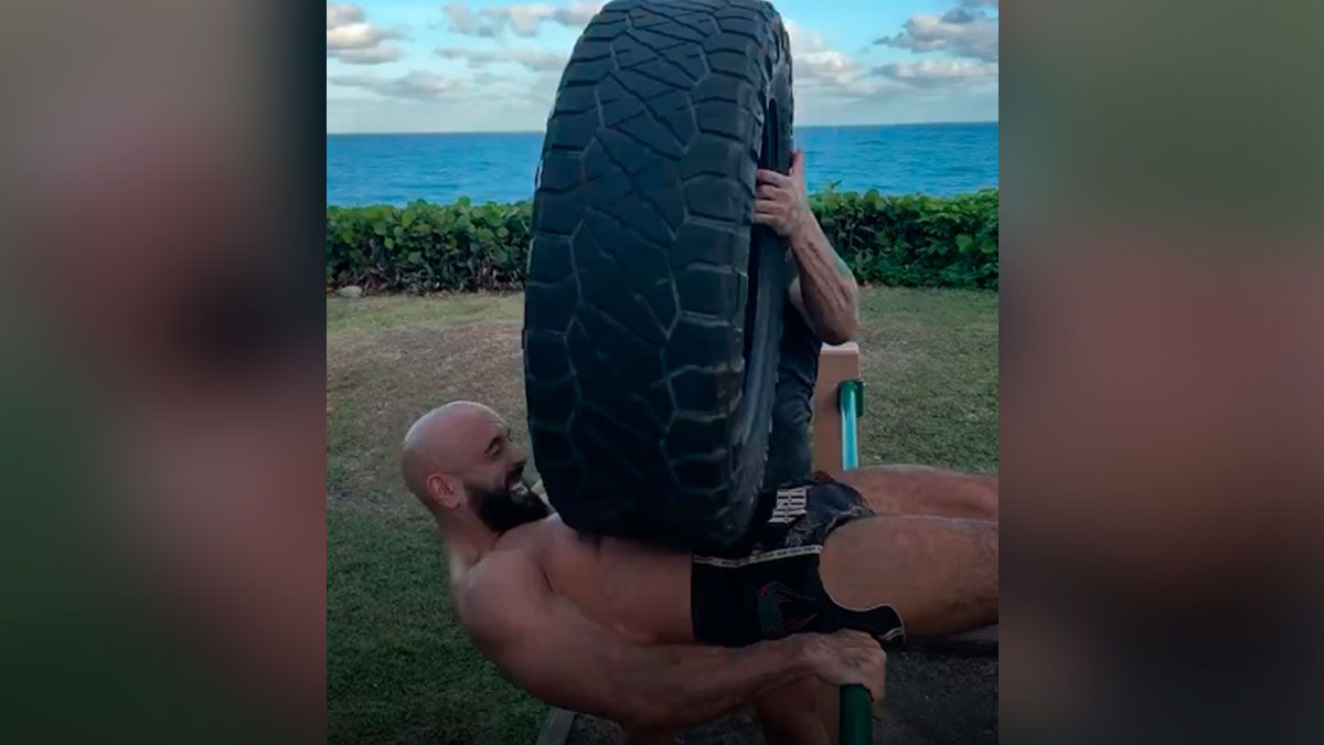 Ubicados en un parque, Cheuko y Luan Aguirre Elias, un reconocido deportista brasileño dedicado a las artes marciales, dejaron entrever la rudeza de su preparación para mantenerse en forma. Con un método que dista de los convencionales, el guardaespaldas le pidió a su colega que utilice un neumático, símil al que tiene un camión, para probar la resistencia de la zona media.