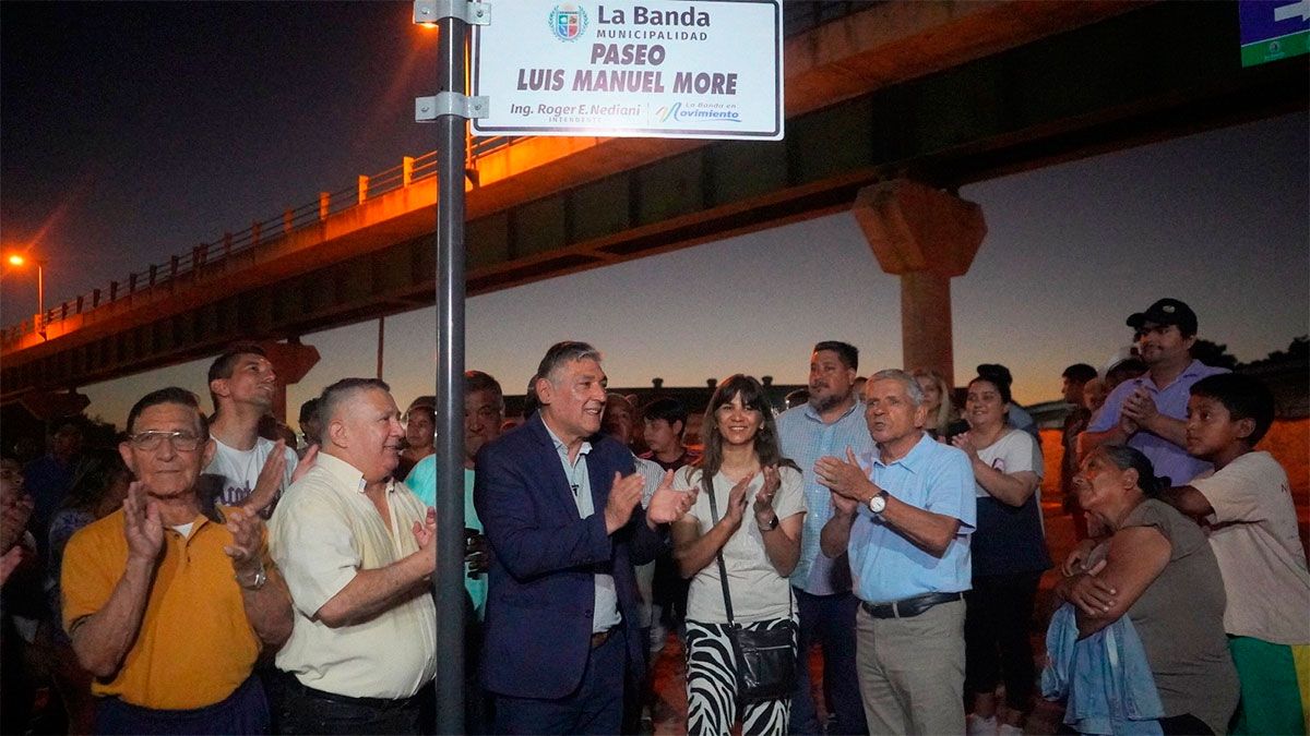 Por su parte, Hugo More, expresó: “Me siento muy emocionado, esto es algo maravilloso y muy lindo. Mi hermano se lo tiene bien merecido, por lo tanto, quiero agradecer al intendente Roger Nediani y al concejal Miguel Montenegro que llevaron adelante este proyecto. Agradecer también a la gente que ha venido a compartir este momento tan especial para la familia de Radio Satelital. El intendente Roger Nediani viene haciendo muchas cosas linda en La Banda, cosas que van a quedar para la posteridad como este hermoso paseo que lleva el nombre de mi hermano”.