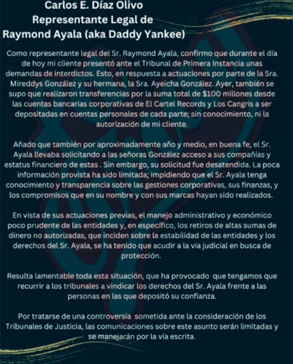 En otro fragmento de su carta, Mireddys pidió respeto por su familia, y aclaró que no aceptará difamaciones de ningún tipo: “Quiero regirme por la justicia y la verdad”. En las últimas horas, el medio La Comay TV compartió un escrito del representante legal del artista de reggaetón, donde se leyó que Mireddys y su hermana retiraron 100 millones de dólares de las cuentas bancarias de Daddy.