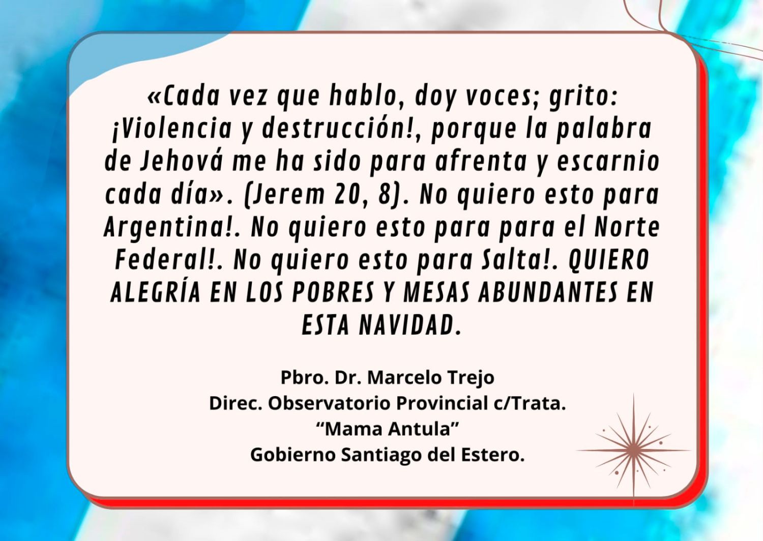 “Cada vez que hablo , doy voces; grito ´violencia y destrucción´, porque la palabra de Jehová me ha sido para afrenta y escarnio cada día (Jeremías 20,8). No quiero esto para Argentina. No quiero esto para el Norte federal. No quiero esto para Salta. Quiero alegría en los pobres y mesas abundantes en esta Navidad”, sostuvo el sacerdote Marcelo Trejo por el hecho que se cobró la vida de una persona.