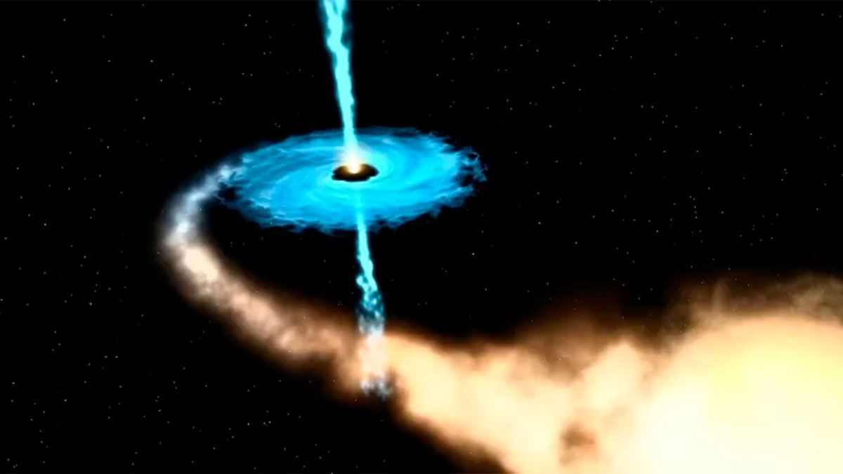 En su núcleo se encuentra un agujero negro supermasivo, con una masa que es unas 20.000 millones de veces la del Sol. Al atraer materia, este agujero negro genera energía descomunal, calentando gas y polvo a temperaturas extremas.