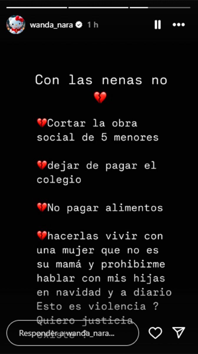 En ese contexto, Wanda se encuentra en Punta del Este por motivos laborales. Desde allí, este jueves elevó un fuerte mensaje a través de sus historias de Instagram, en donde apuntó contra Icardi, y se expresó de manera contundente. “Con las nenas no”, se titula su escrito, en letras blancas sobre un fondo negro. “Cortar la obra social de 5 menores. Dejar de pagar el colegio. No pagar alimentos. Hacerlas vivir con una mujer que no es su mamá y prohibirme hablar con mis hijas en Navidad y a diario. ¿Esto es violencia? Quiero Justicia. ¿Existe?”, se preguntó a sí misma.