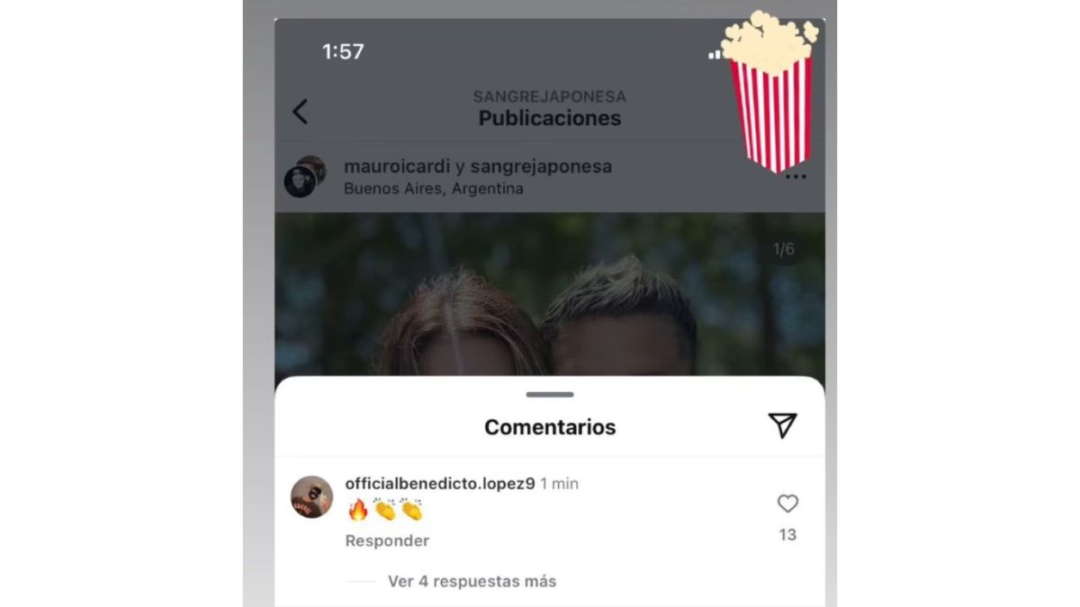 Se trata de un comentario que hizo Benedicto López, el hijo menor fruto de la relación de la empresaria con Maxi López. A los pocos minutos de que Icardi publicara una serie de fotos con la actriz de Casi Ángeles, el menor del clan López dejó tres emojis: uno de un fueguito y dos de las manos aplaudiendo.
