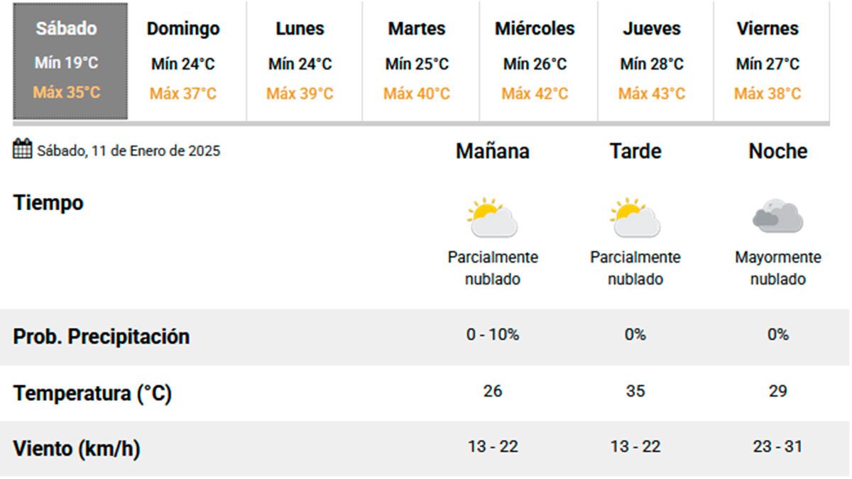 Santiago del Estero sumará este sábado 11 de enero de 2025 una nueva jornada pesada y sofocante en materia climática. Sí, de acuerdo a lo informado por el Servicio Meteorológico Nacional, se espera que la máxima alcance los 35 grados en horas de la tarde, en un día que se presentará con cielo despejado a parcialmente nublado.