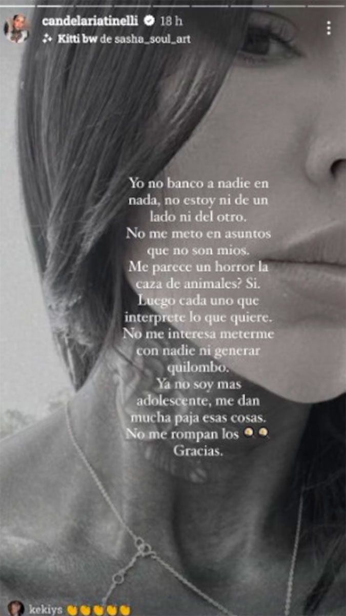 En medio de la controversia generada por las imágenes de Mauro Icardi cazando animales junto a su hija, Cande Tinelli se pronunció nuevamente en sus redes sociales para aclarar su postura tras los comentarios que había realizado días atrás. En su publicación, la hija de Marcelo Tinelli dejó en claro que no desea involucrarse en conflictos ajenos ni tomar partido en debates que no considera propios. “Yo no banco a nadie en nada. No estoy ni de un lado ni del otro. No me meto en asuntos que no son míos”, afirmó categóricamente. A pesar de expresar su repudio hacia la caza de animales, indicó que no busca generar enfrentamientos. “¿Me parece un horror la caza de animales? Sí. Luego cada uno que interprete lo que quiera. No me interesa meterme con nadie ni generar quilombo”, agregó, aludiendo al impacto mediático que habían causado sus palabras.