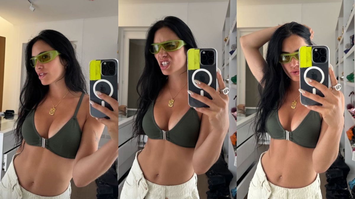 La cantante compartió una selfie frente al espejo luciendo un corpiño texturado con aplique metálico, minishort denim y accesorios glamorosos. Cara lavada y manicura “glazed donut” completaron su estilo relajado y chic.