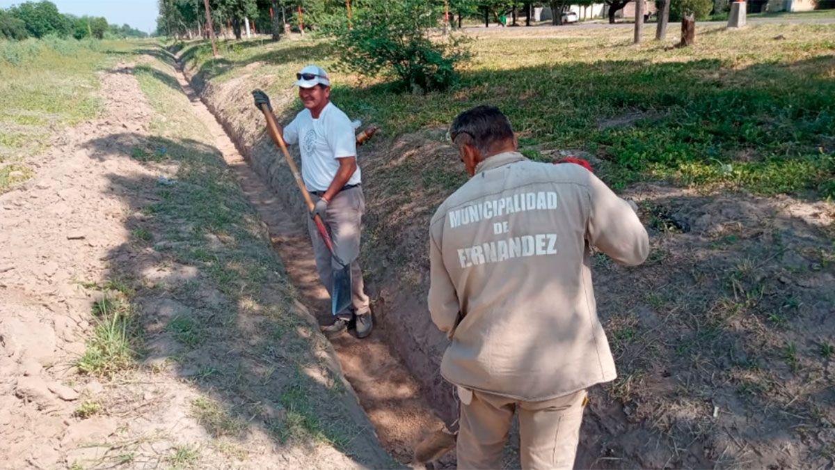 Personal de obras públicas del municipio de la ciudad de Fernández procedió al desmalezado y cavado a uno de los desagües del sector sur de la ciudad, más precisamente el que corre paralelo a la Avenida del Agro, para dar profundidad y facilitar el flujo de los residuos pluviales.