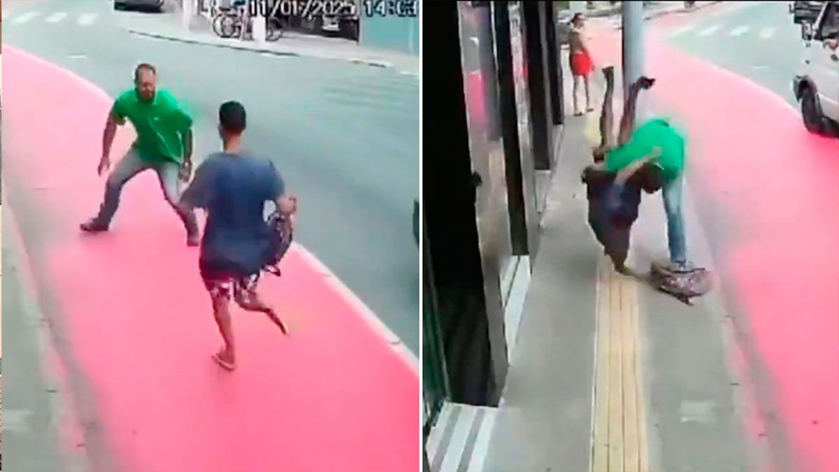 Otra cámara ubicada en la calle grabó a un segundo hombre que esperaba a que el ladrón se acerque a él mientras huía para lanzarlo contra la acera e inmovilizarlo con una llave de jiu-jitsu. Luego, un testigo se aproximó para ayudar a quitarle la bolsa al delincuente.