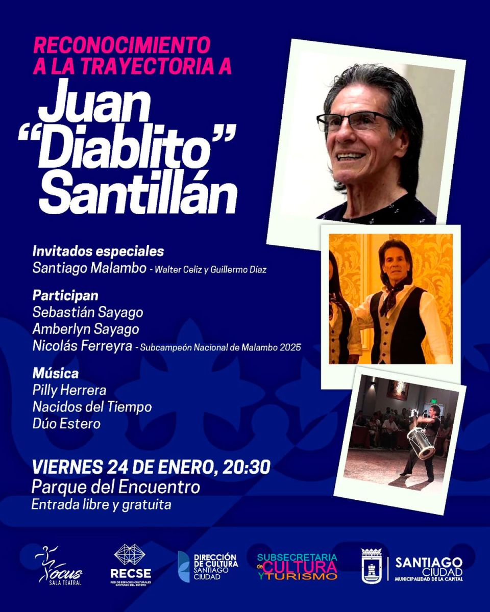 Este viernes 24 de enero a partir de las 20.30 horas, miembros de la comunidad artística local, con el acompañamiento de la Municipalidad de la Capital, realizarán en las instalaciones del Parque del Encuentro (Parque Aguirre) un reconocimiento a la trayectoria del destacado bailarín Juan “El diablito” Santillán.