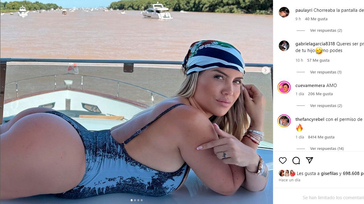 Mientras los chicos jugaban en el agua, la influencer retrató su outfit con una serie de fotos y videos. El romántico comentario de L-Gante.