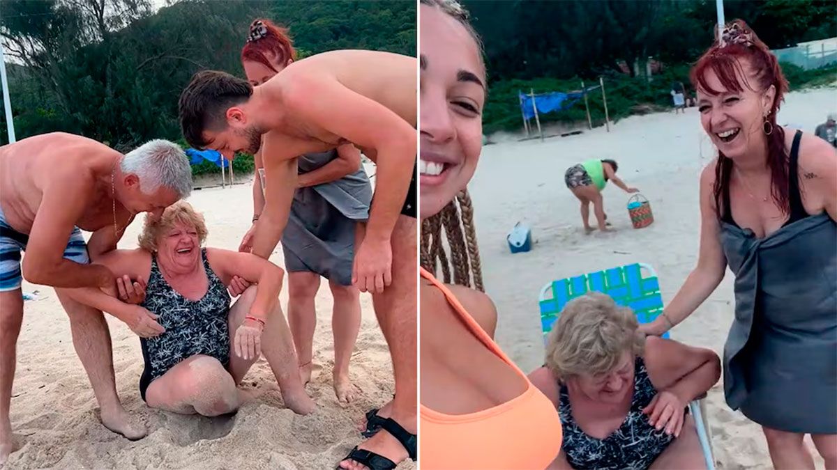 De acuerdo con el video compartido en la plataforma, la escena comienza con la abuela riendo a carcajadas mientras está de rodillas en la arena. A raíz de esta situación, uno de sus nietos le preguntó qué había tomado. Ella muy firme respondió: “Caipiriña”.