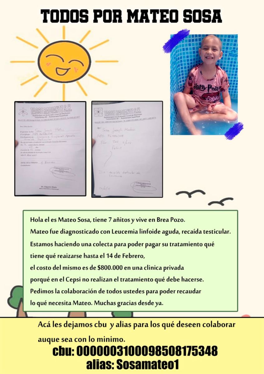 Mateo Sosa, un niño de 7 años que vive en Brea Pozo, atraviesa una dura batalla contra la leucemia linfoide aguda, una enfermedad que recientemente ha recaído en su cuerpo de manera testicular. Su familia enfrenta una difícil situación económica para poder costear el tratamiento necesario que debe iniciar antes del 14 de febrero.