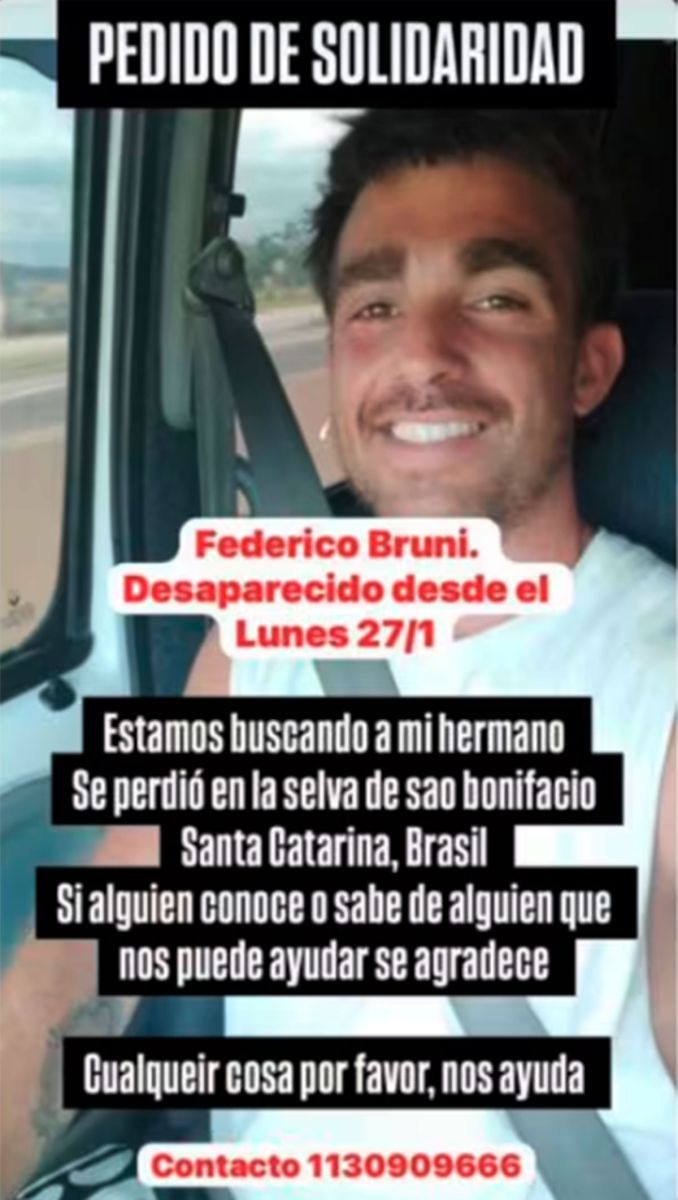 Desde el lunes 27 de enero, Federico Bruni, un joven argentino, se encuentra desaparecido en la selva de São Bonifácio, ubicada en el estado de Santa Catarina, al sur de Brasil, a unos 42 kilómetros de Florianópolis. Su familia y amigos lanzaron un llamado urgente a la solidaridad para dar con su paradero.