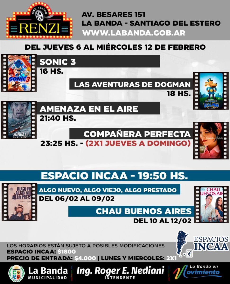 La Municipalidad de La Banda informa que el Cine Teatro Renzi dependiente de la Secretaría de Comunicación presentará una nueva programación del 6 al 12 con una variada selección de películas para toda la familia.
