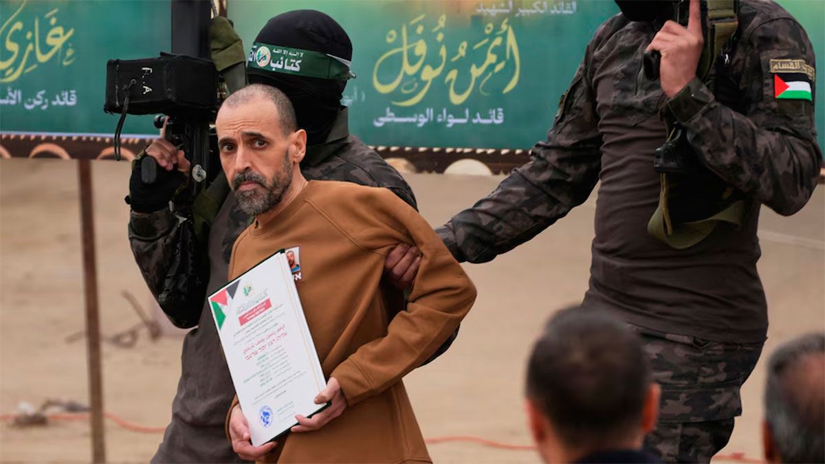 Es que, en medio de la liberación, los integrantes de Hamas sacaron a los tres hombres de una furgoneta blanca, los llevaron a un escenario instalado en la ciudad de Deir al-Balah y, frente a cientos de personas, sostuvieron un micrófono ante cada uno de ellos y por turnos los obligaron a hacer una declaración. Las veces anteriores los rehenes no habían hablado.