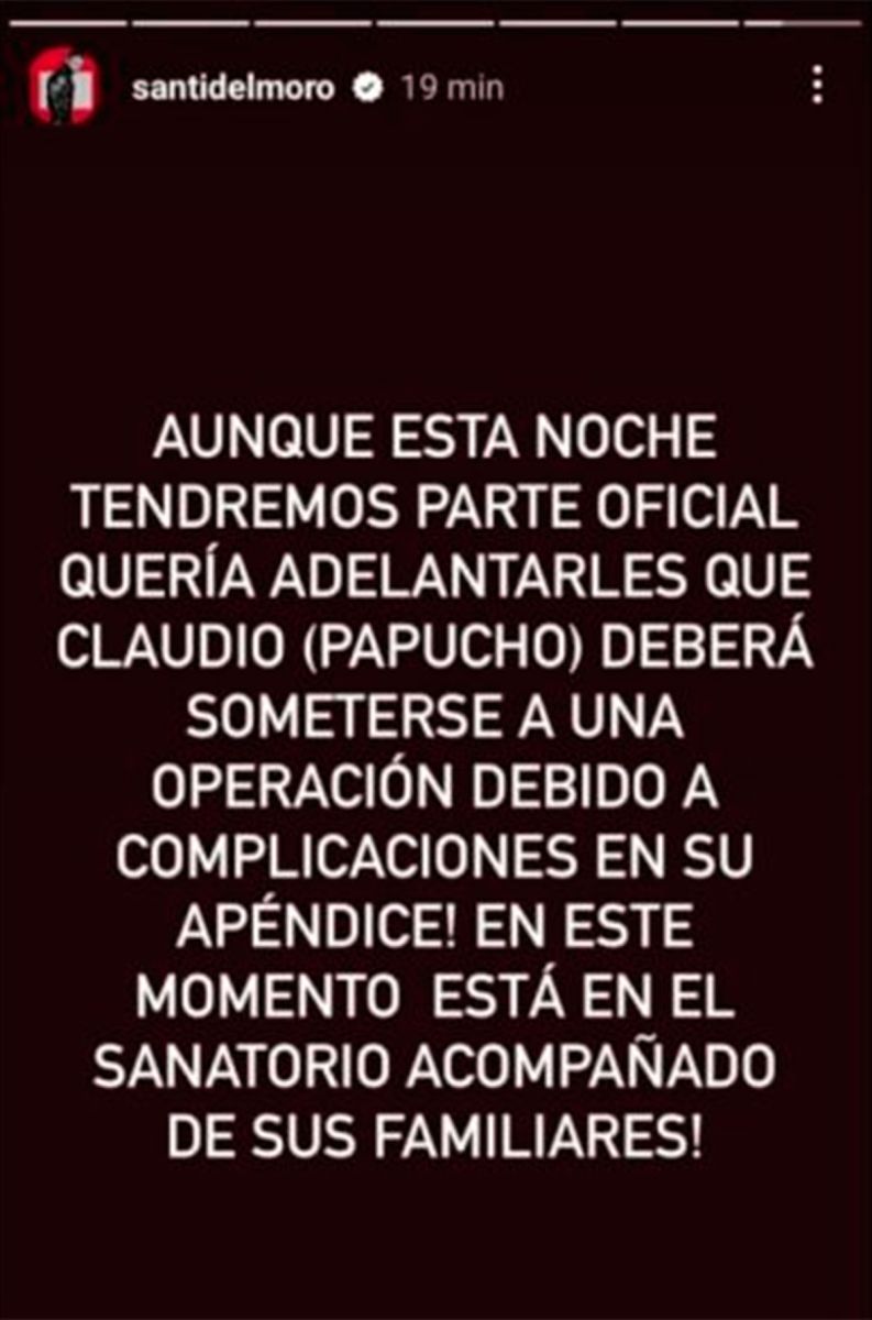 "Aunque esta noche tendremos parte oficial quería adelantarles que Claudio (Papucho) deberá someterse a una operación debido a complicaciones en su apéndice", escribió Del Moro.