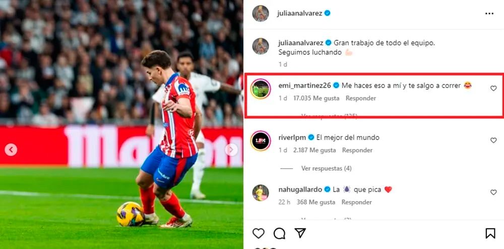 Julián Álvarez fue protagonista en el empate 1-1 entre Atlético de Madrid y Real Madrid, y su lujosa definición de penal a lo ‘Panenka’ no pasó desapercibida. Tras el partido, el delantero compartió una foto del momento en sus redes sociales y recibió un comentario inesperado de Emiliano Dibu Martínez. "Me hacés eso a mí y te salgo a correr", bromeó el arquero de la selección argentina, generando una ola de reacciones entre los fanáticos.