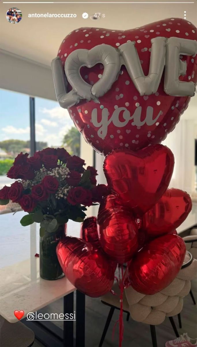 A través de su cuenta de Instagram, la empresaria rosarina subió una foto con el presente del crack argentino: un ramo de rosas rojas, varios globos con forma de corazón y uno gigante con la leyenda “Love You” (Te amo).