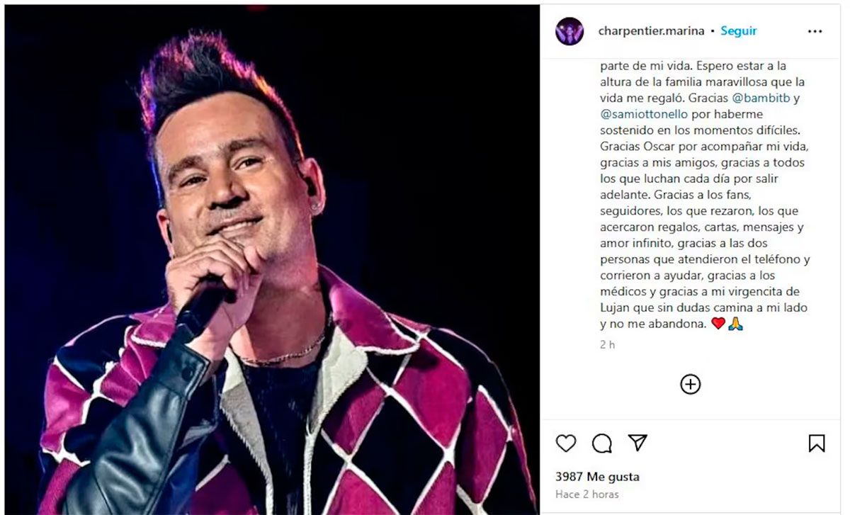 Marina Charpentier hizo un conmovedor posteo en sus redes sociales. Les agradeció a los fanáticos, médicos y familiares que ayudaron al cantante de Tan Biónica en su proceso.