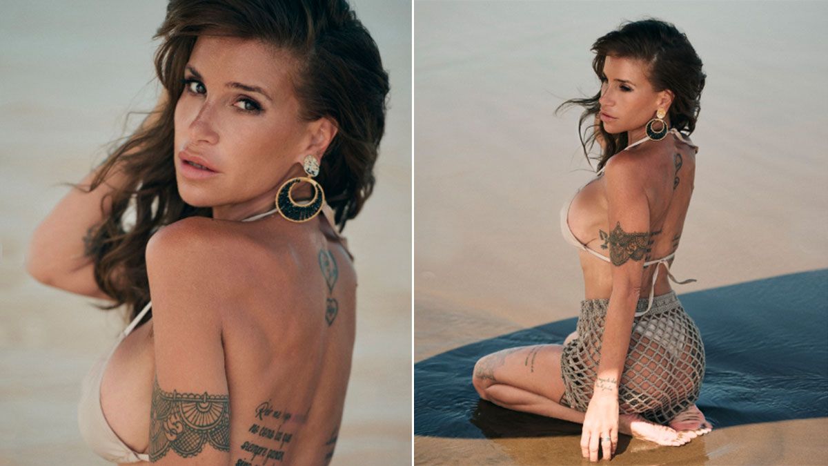 A orillas del mar, la influencer posó de espaldas con un traje de baño de dos piezas color beige de corpiño triangulito que se ata alrededor del cuello y bombacha colaless.